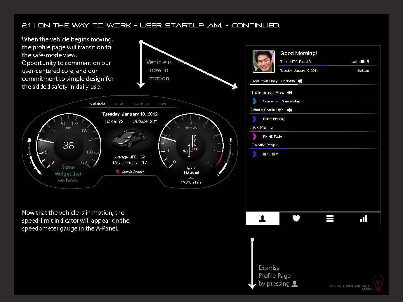 With our generative research phase still coming to a close, I was asked to help plan a demo of our yet to be realized infotainment solution. After talking with management and engineering, it became clear that we needed a highly controlled "smoke & mirrors" type of demo. I went back to our emergent personas and crafted a day in the life scenario around which we could demonstrate technical capabilities of the new system.